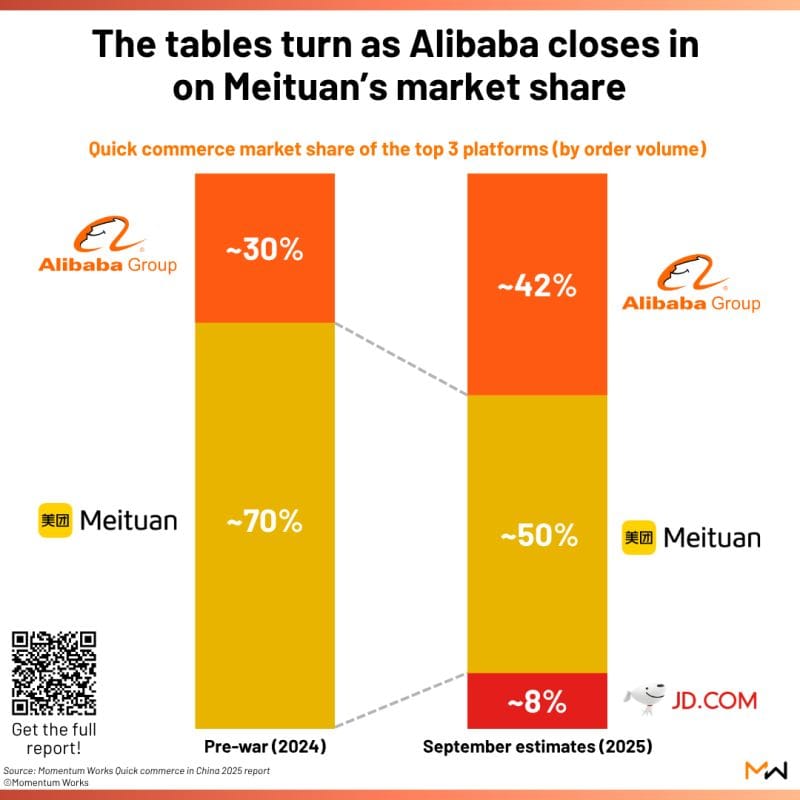 Alibaba is catching up, and Meituan’s lead is slipping. Before subsidies, Meituan held ~70% of China’s food delivery market and Alibaba ~30%. By Sep 2025, estimates show Meituan at 50%, Alibaba at 42%, and JD.com at 8%.