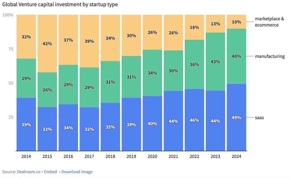 SaaS rose from around 39% in 2014 to nearly 49% last year of funding as investors favored recurring revenue, AI workflows and cleaner unit economics.