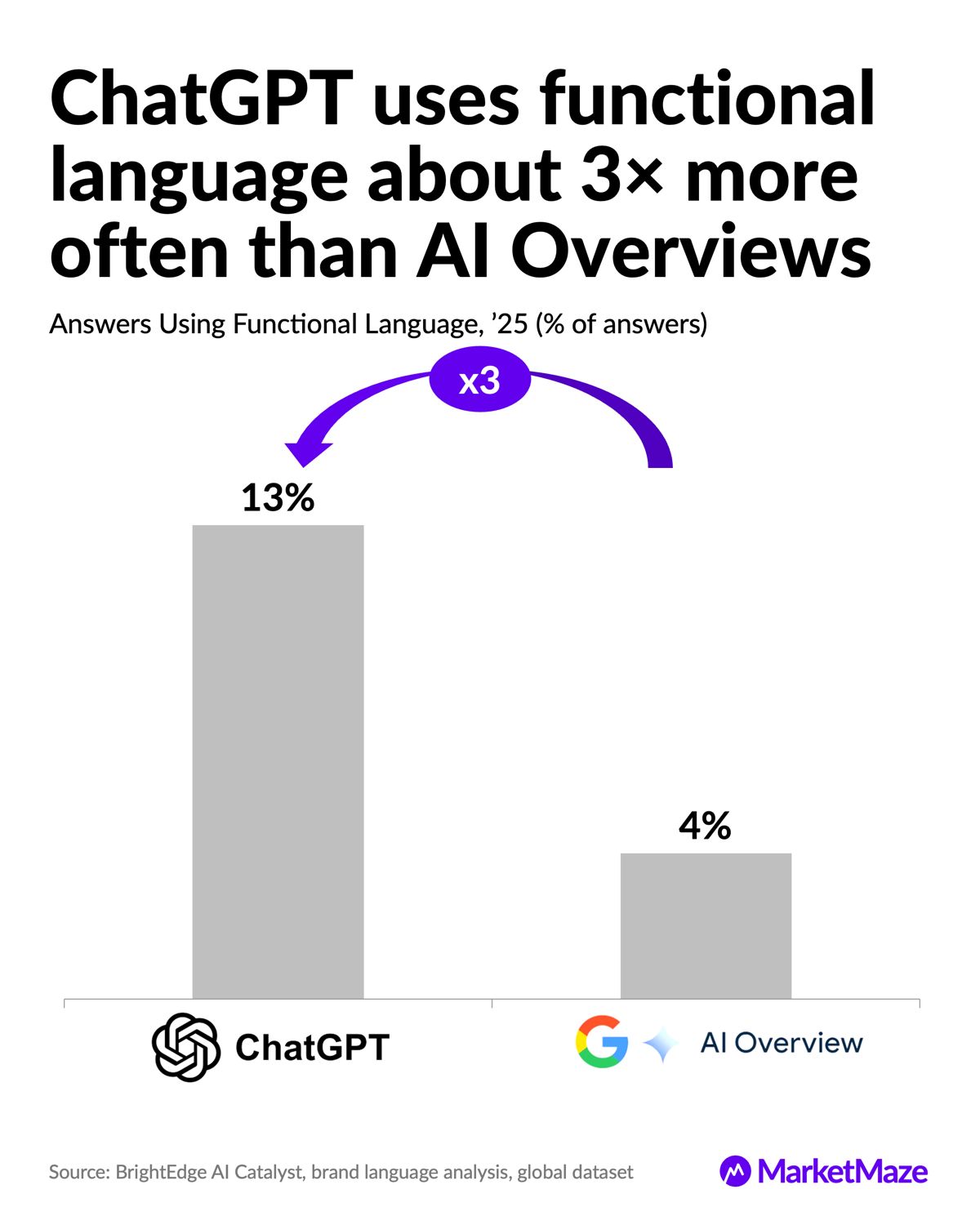 • Functional phrasing appears in 13% of ChatGPT answers versus just 4% in Google AI Overviews, a 3x gap that shapes how brands are understood