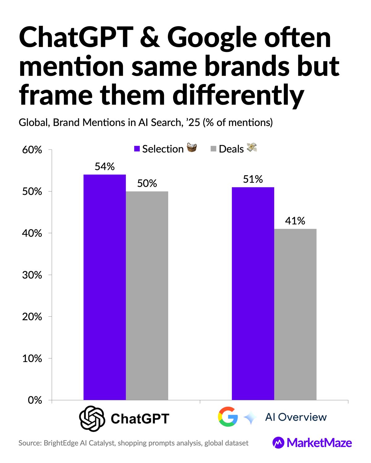 • Google AI Overviews show similar selection at 51% but lower deal emphasis at 41%, instead anchoring brands in price comparison and competitive positioning