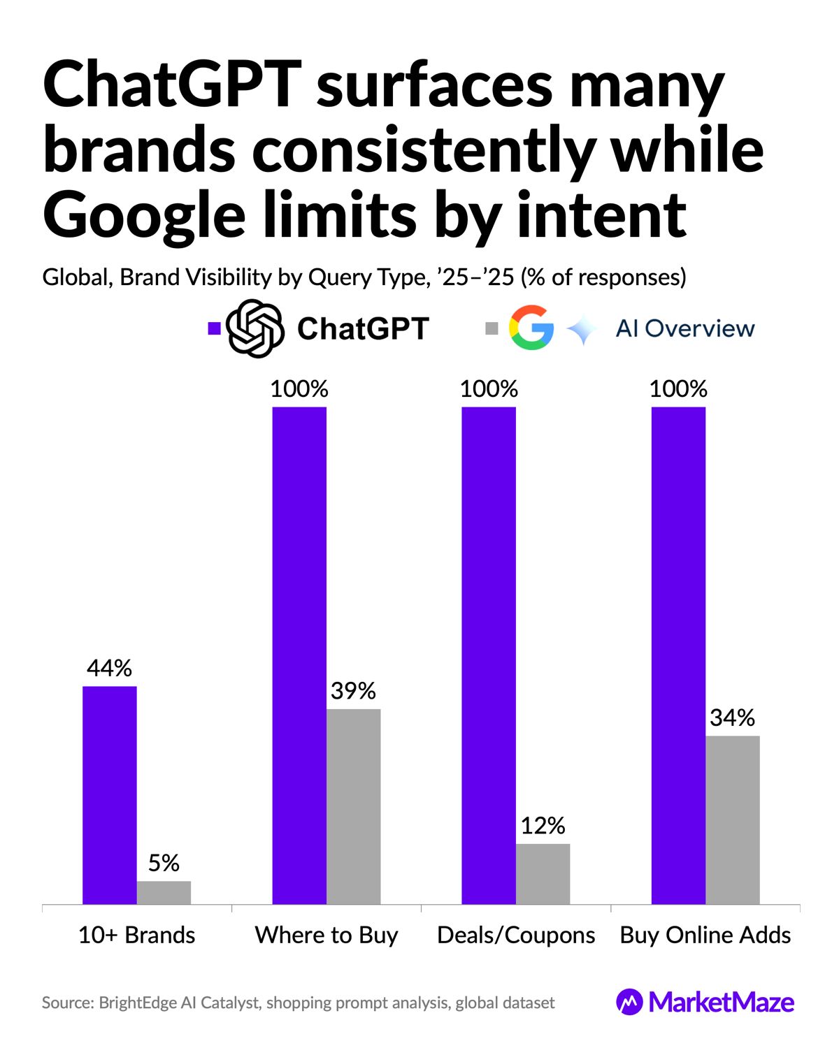 • For deals and coupons, ChatGPT remains at 100% brand visibility, while Google drops to 12%, sharply narrowing choice