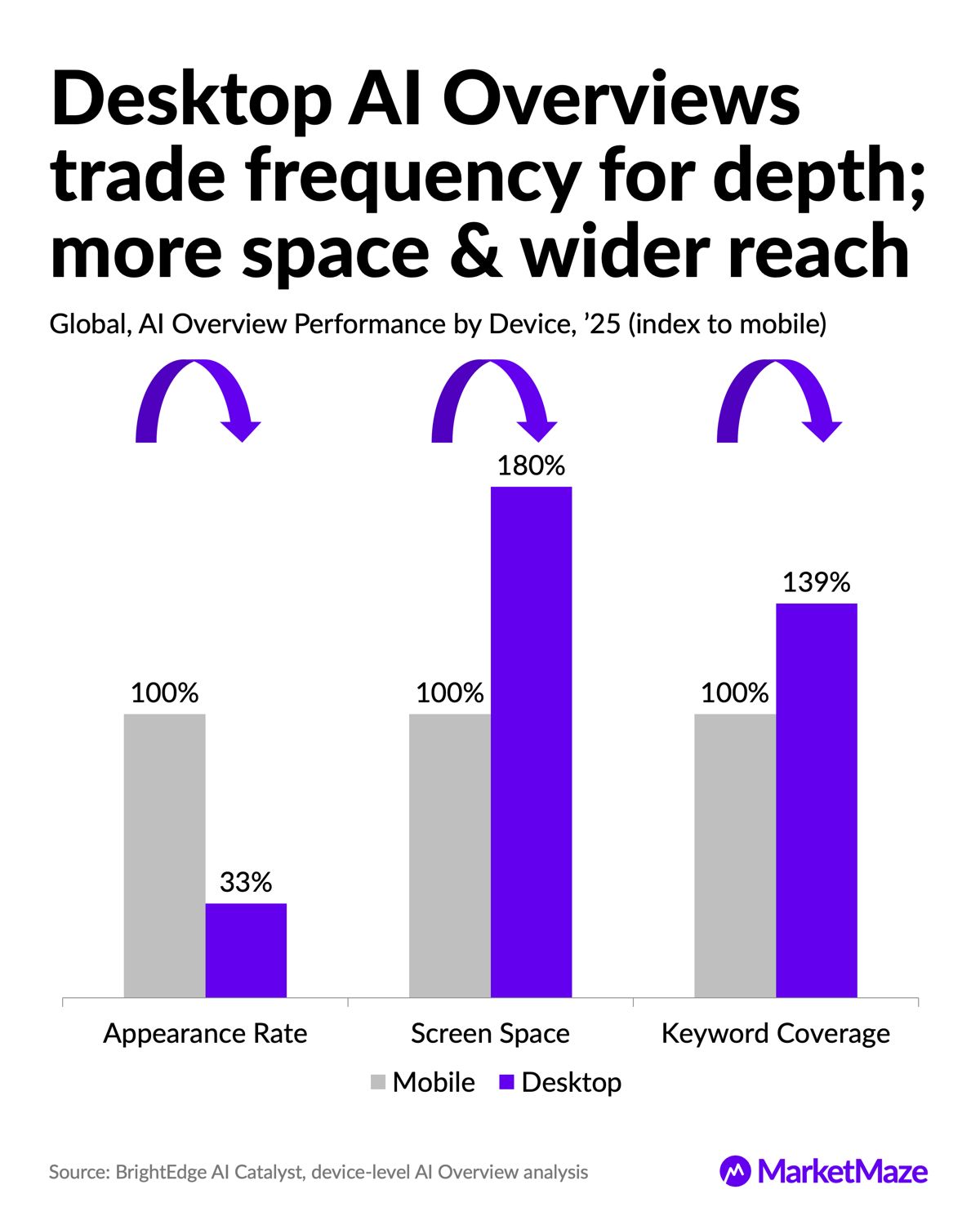 • Desktop AI Overviews appear just 33% as often as mobile, but deliver 180% more screen space for deeper explanations