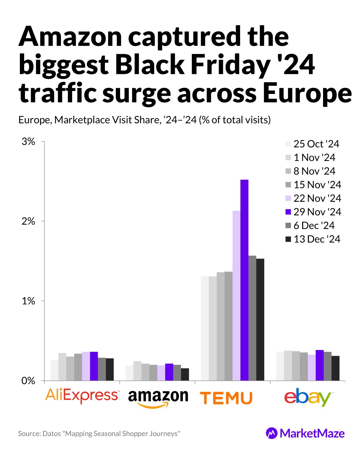 → Amazon’s share moved from about 1.5% mid November to a Black Friday high near 3%, the strongest spike among major EU platforms.