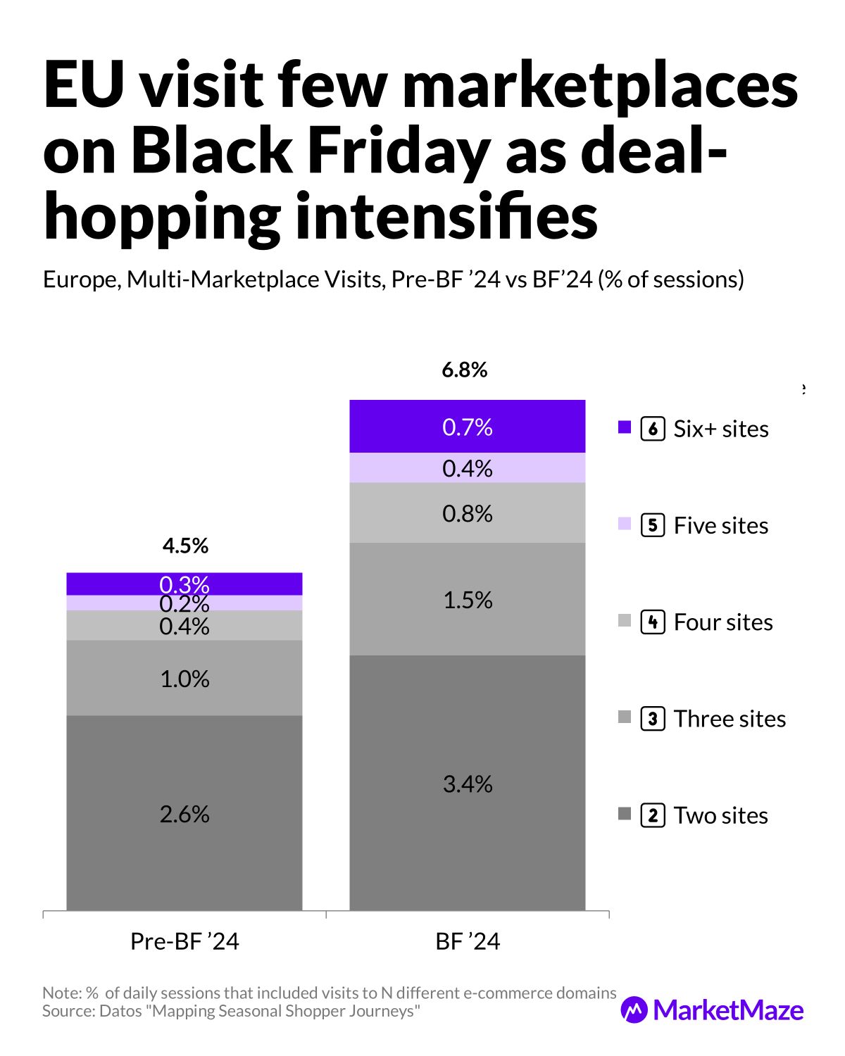 → Multi-marketplace visits climbed from 4.5% to 6.8% on Black Friday as users visited two to six different platforms in a single day.