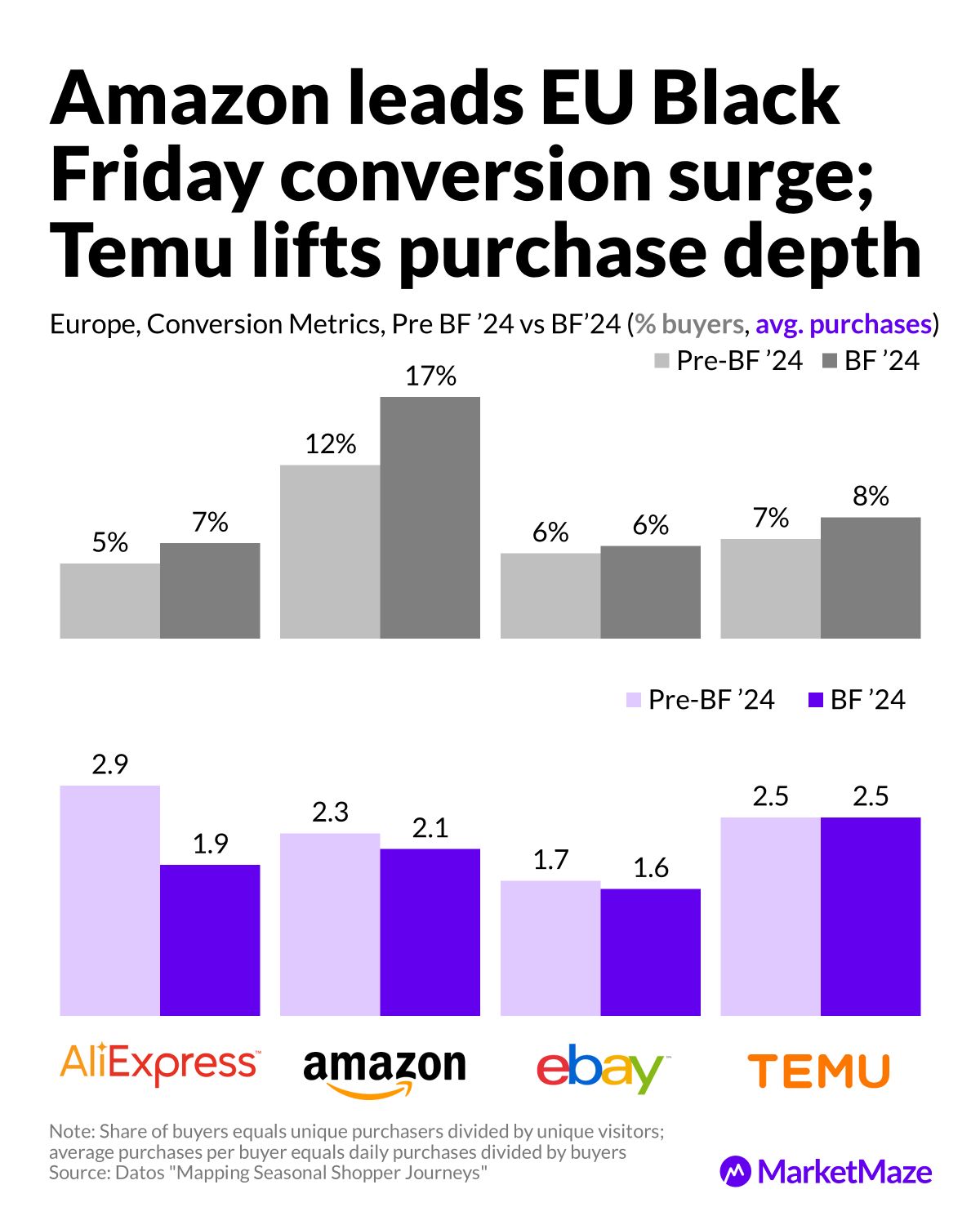 Black Friday improved purchase efficiency across platforms, but Amazon captured the strongest conversion lift and Temu held the best purchase depth.