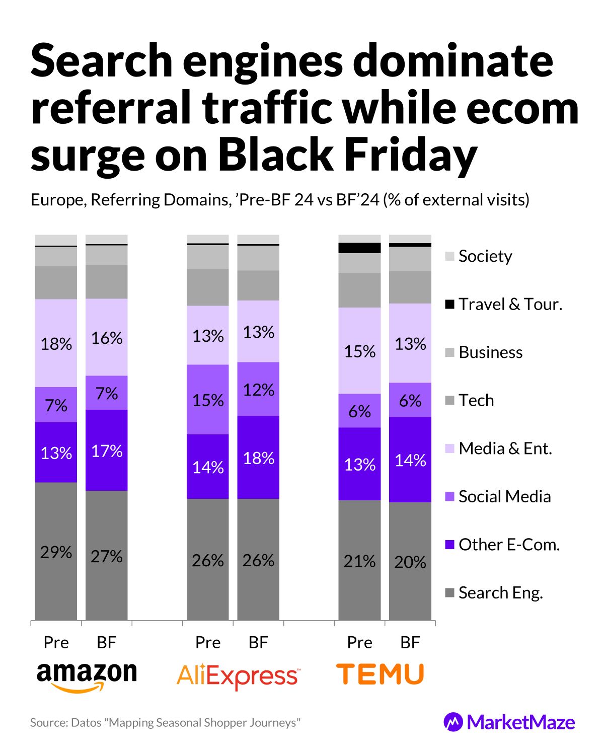 → Search engines drove up to 29% of referrals before Black Friday and 27% on the day, while other e-commerce sites lifted Temu and AliExpress to 18% and 14%.