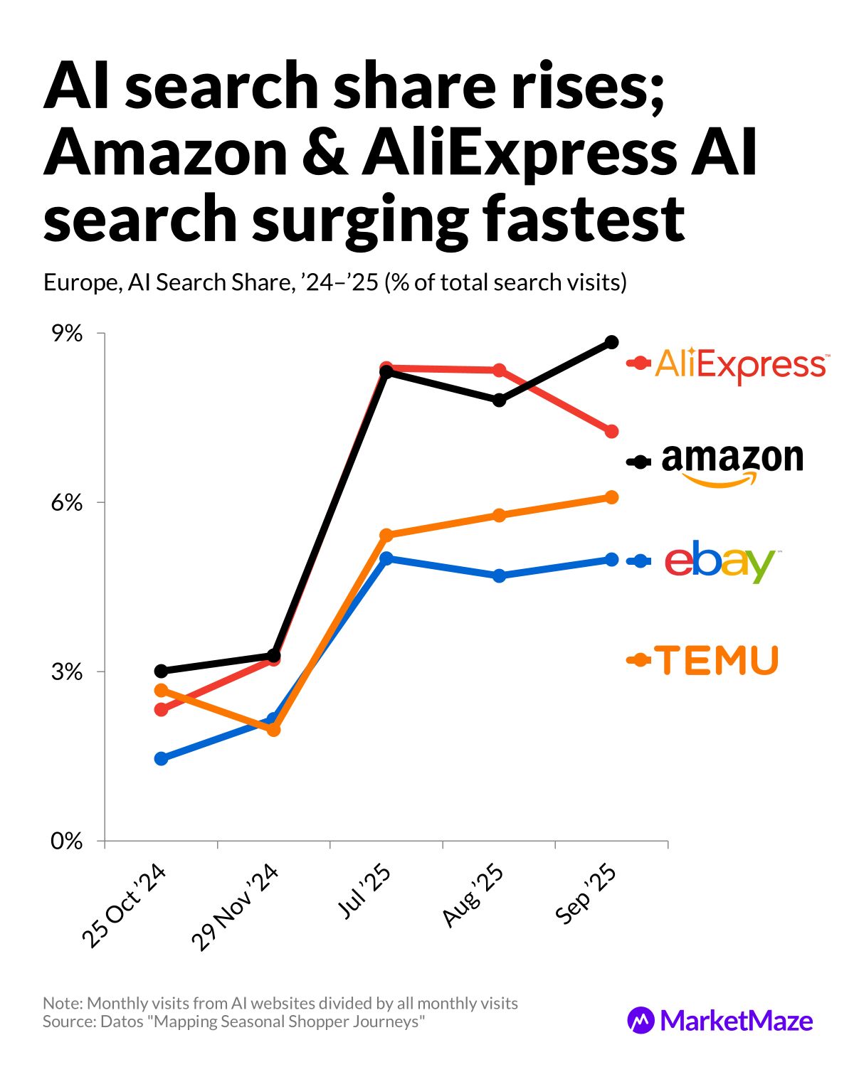 → AI search share jumped from 2 to 3% in late 2024 to 6 to 9% by mid-2025, with Amazon and AliExpress reaching peaks near 8 to 9%.