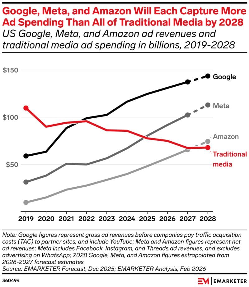 By 2028 Google ad revenue is projected near $144B in the US, Meta around $114B, and Amazon roughly $73B, each rivaling entire traditional media sectors.
