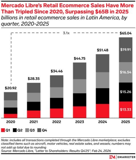 The Maze: MercadoLibre is becoming the backbone of Latin American ecommerce. Marketplace sales more than tripled from about $21B in 2020 to over $65B in 2025, showing how quickly regional platforms can scale once logistics and payments mature.