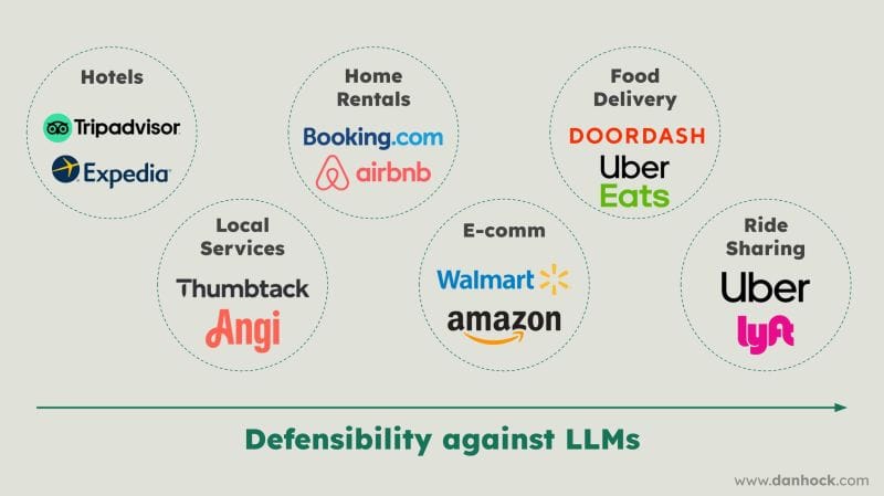 Travel discovery platforms like Tripadvisor and Expedia face higher disruption risk because LLMs can summarize options before users reach their sites.