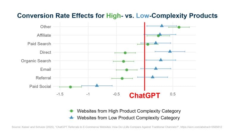 For low complexity products, ChatGPT referrals underperform channels like organic search, email, and direct visits.