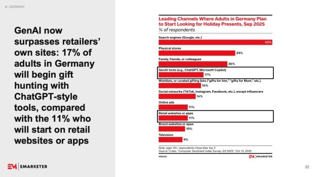 The Maze: Holiday shopping in Western Europe is shifting, and the first click is no longer on a retailer’s site. 17% of German adults now begin their gift hunt with GenAI tools like ChatGPT, ahead of retail apps and brand websites. Search engines still lead, but the rise of AI assistants signals a new gatekeeper emerging between shoppers and merchants, compressing browsing, comparing, and shortlisting into one guided conversation.
