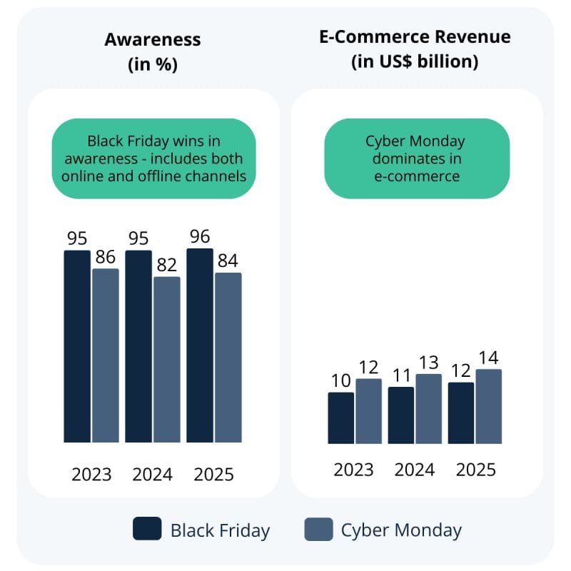 Surveys show 95 to 96% of shoppers recognize Black Friday globally while Cyber Monday ranges in the mid 80s, yet online buyers still shift part of their big ticket spending into Monday.