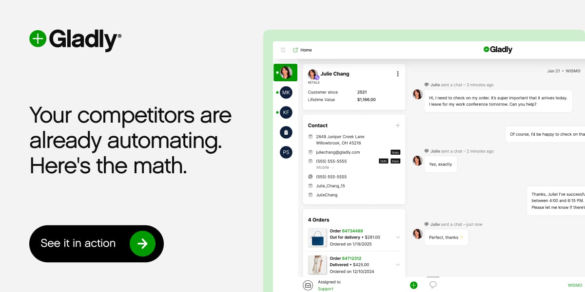 Gladly handles the predictable volume, FAQs, routing, returns, order status, while your team focuses on customers who need a human touch. The result? Better experiences. Lower costs. Real competitive advantage. Ready to see what's possible for your business?