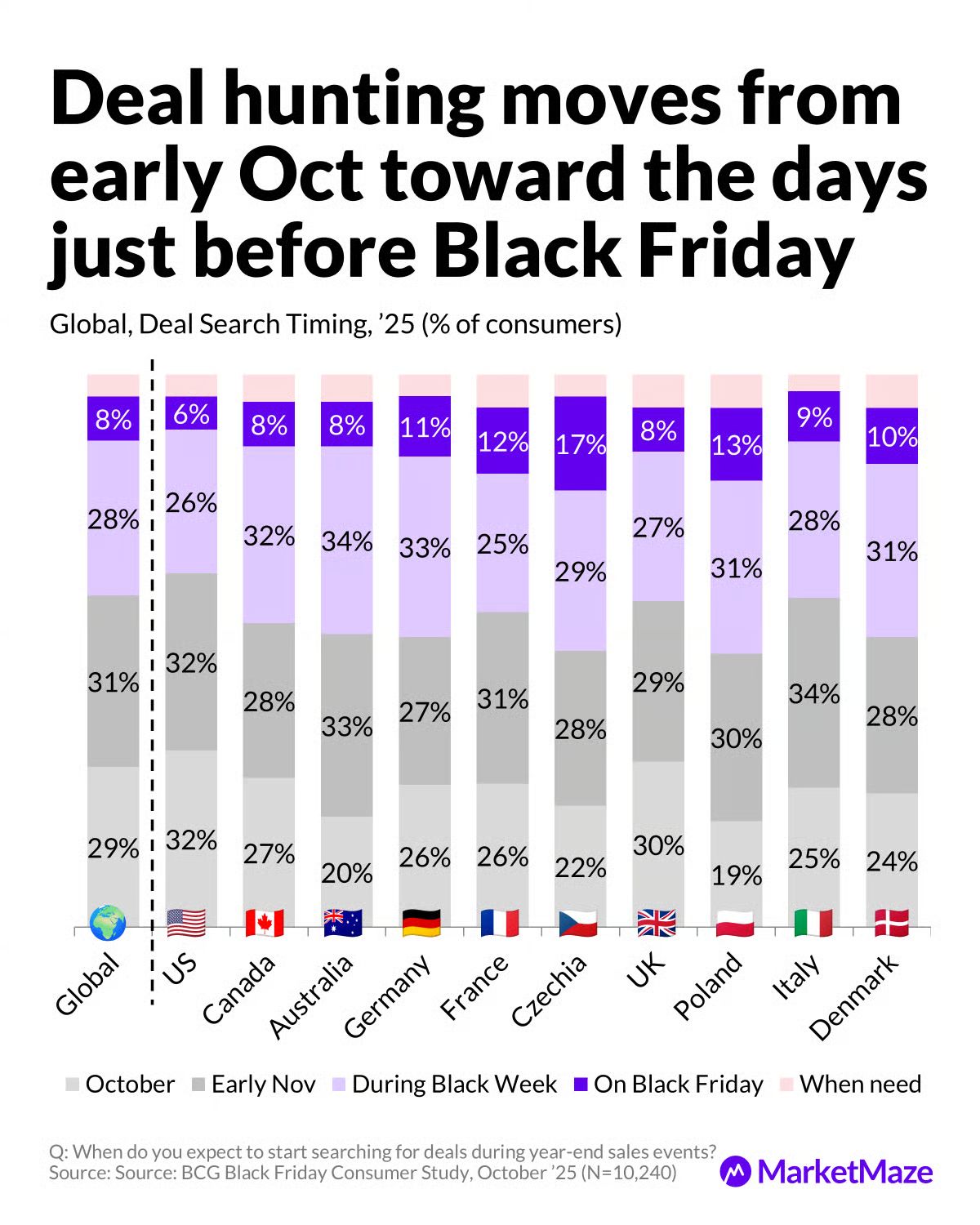 Deal hunting moves later, with 28% searching only days before Black Friday, up as shoppers wait for bigger discounts.