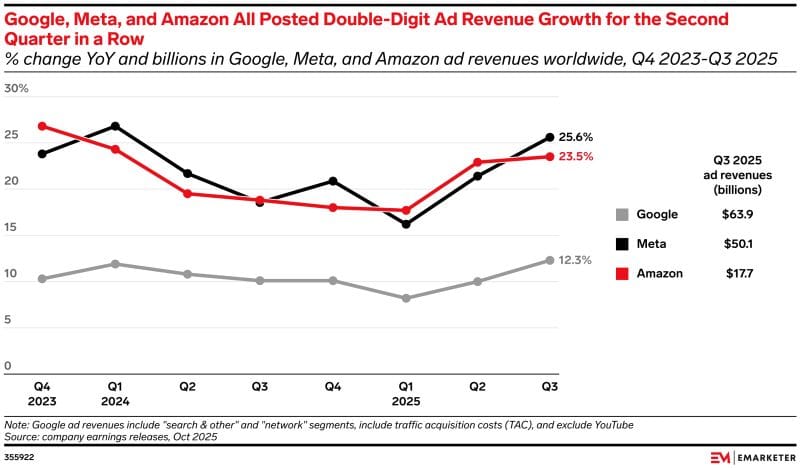 Why it matters: The triopoly still controls most digital ad spending and shows no signs of losing its grip. Strong performance signals that brands are shifting budget toward platforms that combine user intent with AI-powered measurement. The risk is that rising AI investment and tougher rules might slow the momentum, which would ripple across ecommerce players that depend on these platforms for reach, conversion, and growth.