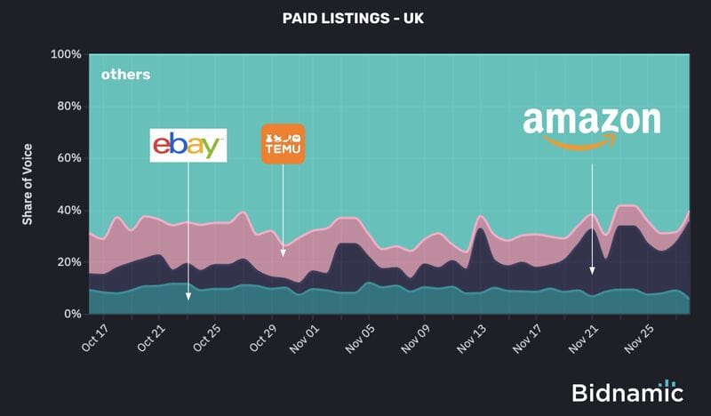 • In the UK Amazon tripled its visibility to around 30% on Black Friday after holding near 9% for most of the season, proving its willingness to outbid rivals when demand is highest.