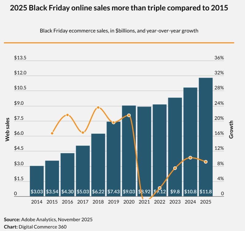 Happy Sunday! Black Friday online sales in the US surged to a record $11.8B, a massive spending spree powered by steep retailer discounts and rising mobile engagement. Crucially, the growth was significantly bolstered by both AI-driven shopping tools and Buy Now, Pay Later services.