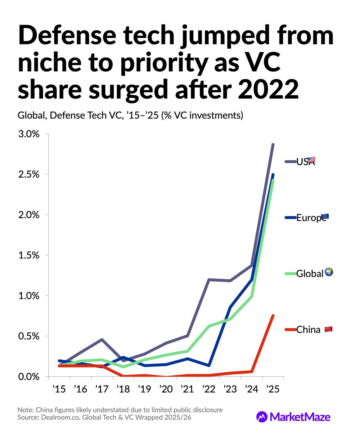 • Defense inflection: Defense tech jumped from ~0.3% of VC pre 2022 to ~2% globally by 2025, led by the US and Europe after security priorities reset