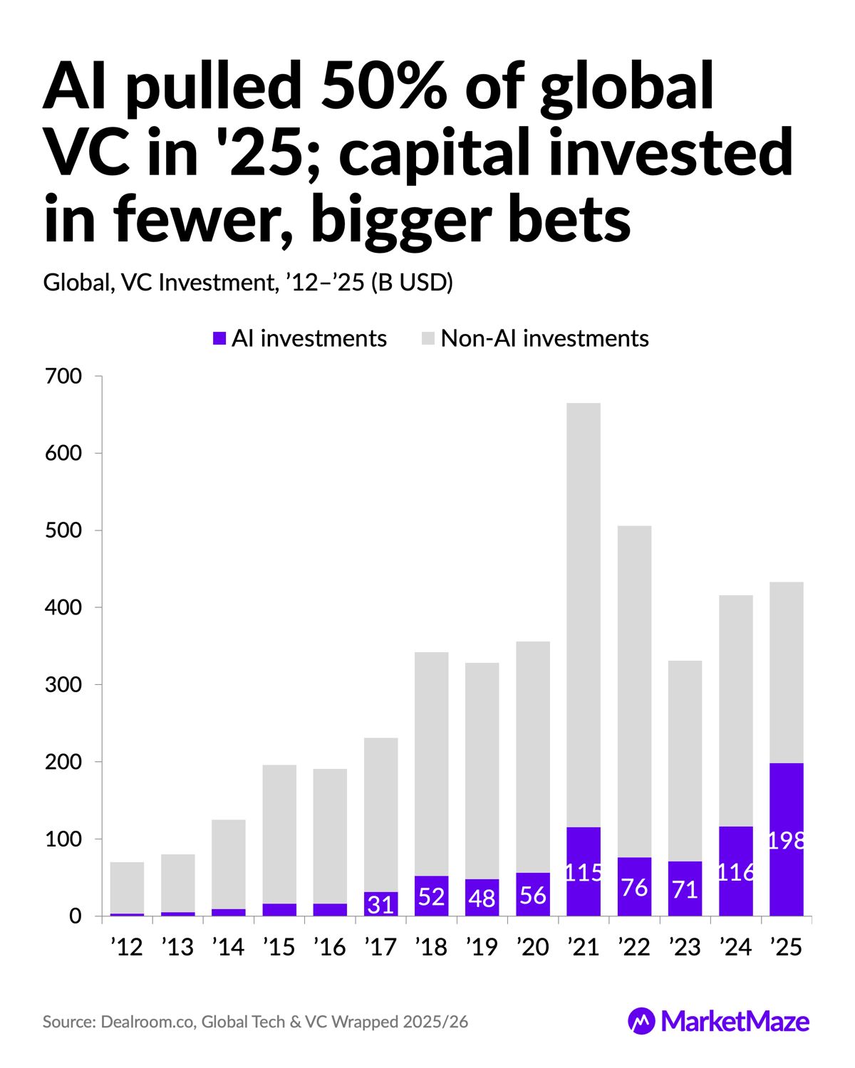 • AI concentration: AI absorbed $198B in 2025, nearly 50% of global VC, while total deal count fell, signaling bigger checks into fewer platforms