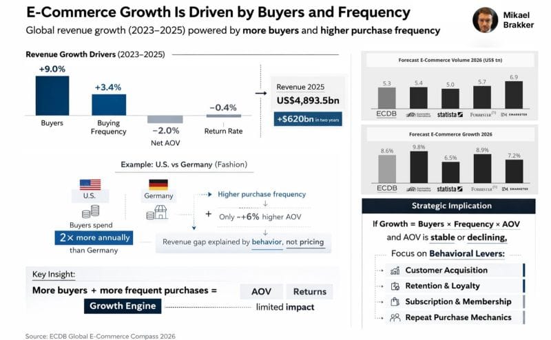 Global ecommerce revenue reached roughly $4.9T in 2025, growing by about $620B in two years, with most of that increase coming from new buyers and more frequent purchases.