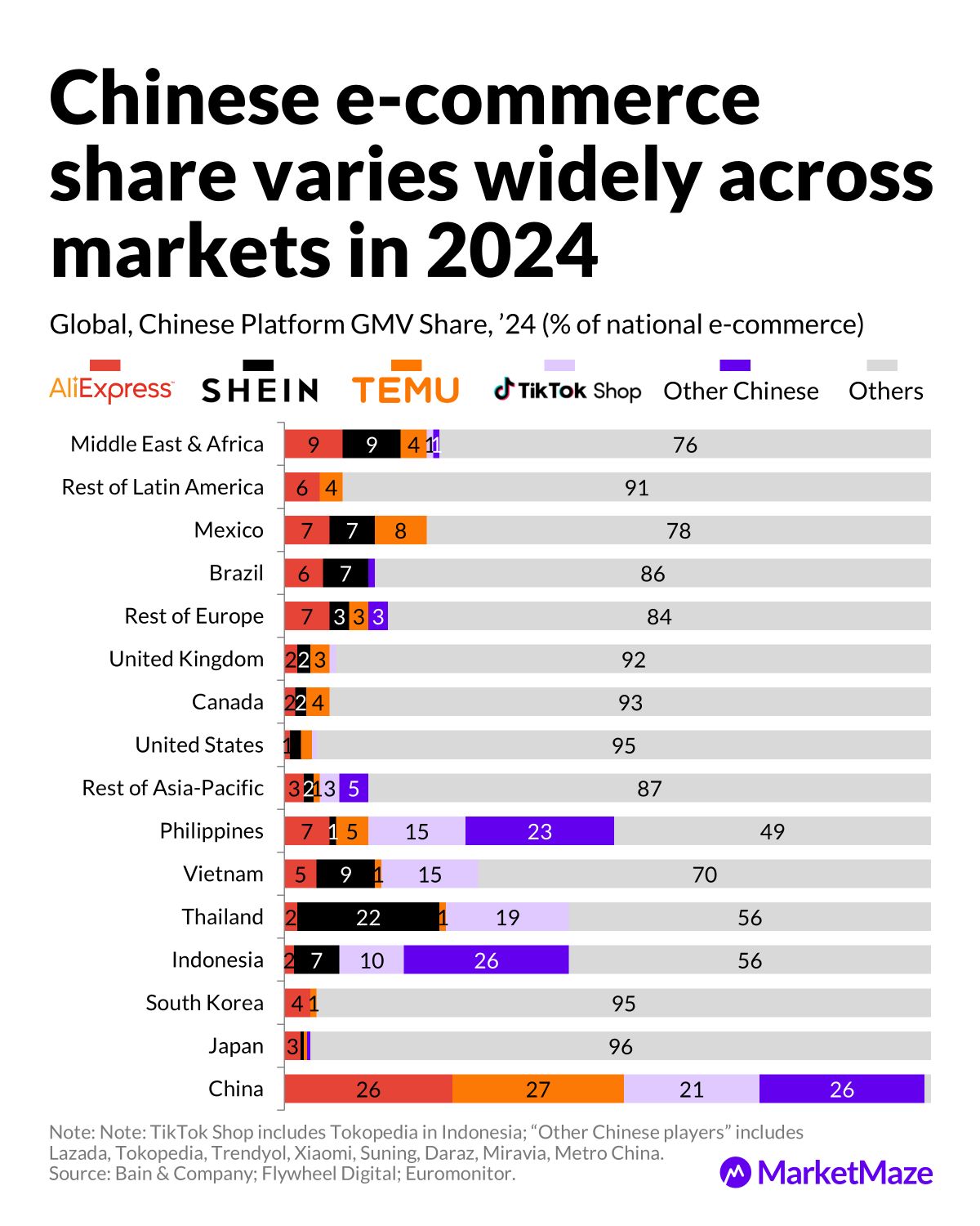 Chinese retailers GMV share hits up to 56% in Indonesia and 49% in the Philippines while US, UK, Japan remain above 90% local due to stronger incumbents and higher consumer expectations.