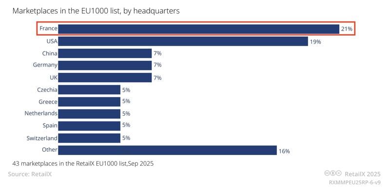 The Maze: France did not build Europe’s biggest marketplaces, it built the most of them. With 21% of EU1000 marketplaces headquartered there, France shows what early adoption looks like when third party selling becomes a standard retail skill, not a side bet.