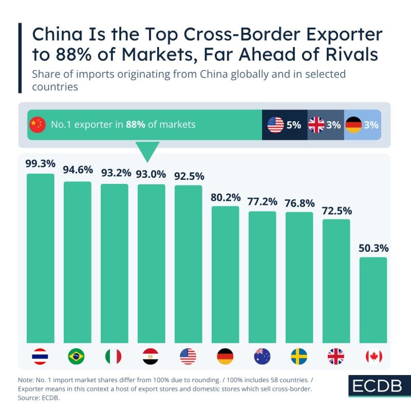 China ranks as the top source of ecommerce imports in most markets, exceeding 90% share in countries like Thailand, Brazil, Italy, Egypt, and even the US.