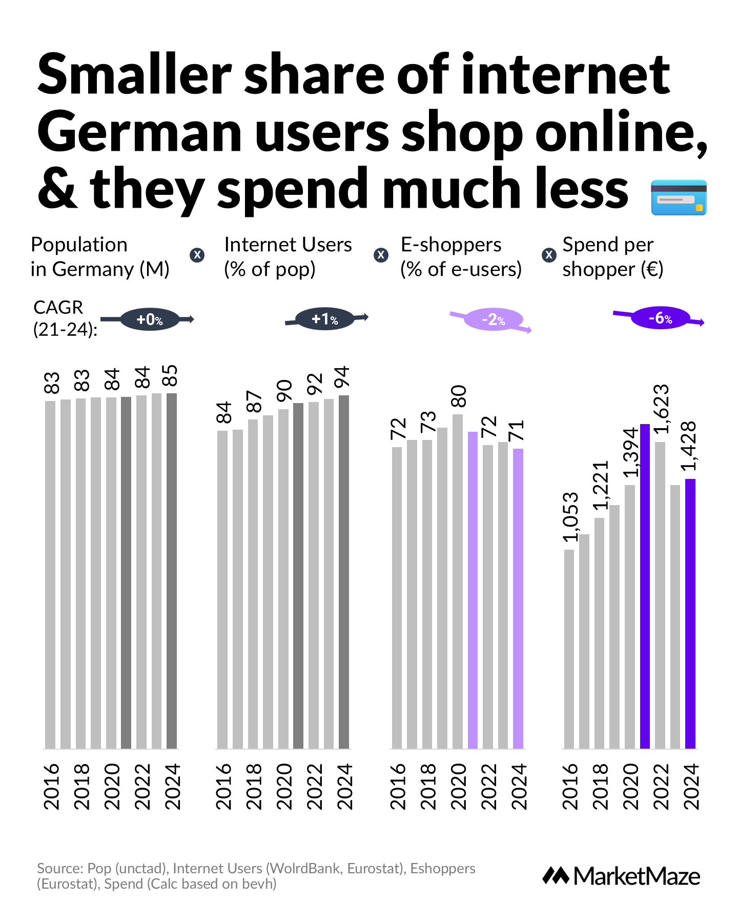 Fewer Germans are shopping online, and they are spending less. The share of internet users shopping online fell from 80% in 2021 to 71% in 2024. Meanwhile, annual spending per shopper declined from €1,623 in 2021 to €1,428 in 2024. This represents a 6% average annual drop (CAGR), highlighting a sustained downward trend.