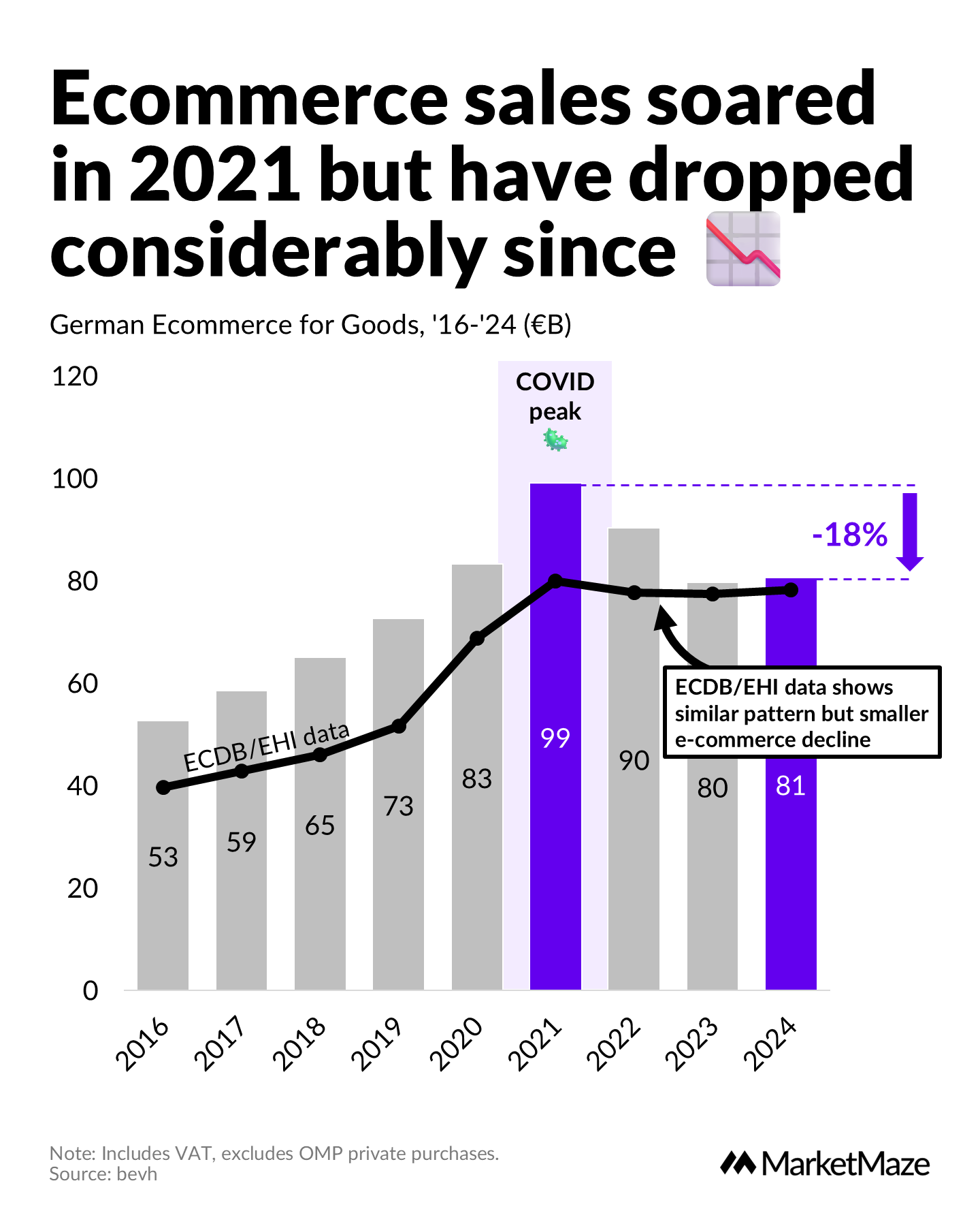 The pandemic’s ecommerce surge has fully faded. In absolute numbers, online retail peaked at €99B in 2021 but fell to €80B in 2023. A minor increase to €81B in 2024 suggests stabilization, but no real recovery. ECDB/EHI data confirms a similar trend, showing consistent declines post-2021 with only a slight uptick in 2024.