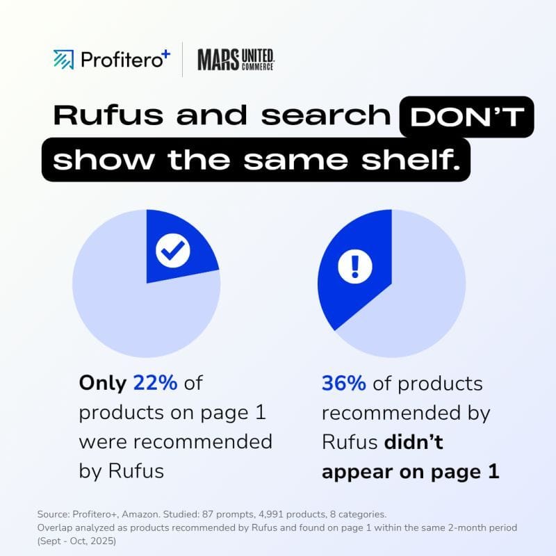 The Maze: Rufus is rewriting Amazon discovery. Profitero+ finds that only 22 percent of page-1 search products also appear in Rufus answers, proving that AI is running a different selection logic than the search algorithm. At the same time 36 percent of Rufus picks are nowhere on page 1, showing how AI elevates products that search ignores. This is the start of a split digital shelf where rank and relevance no longer move together.