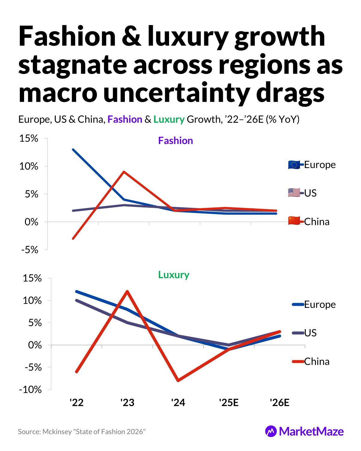 Europe, US and China all slide toward low single digit fashion growth by 26E, with China swinging from 12 percent luxury growth in 23 to negative in 24 before stabilising.