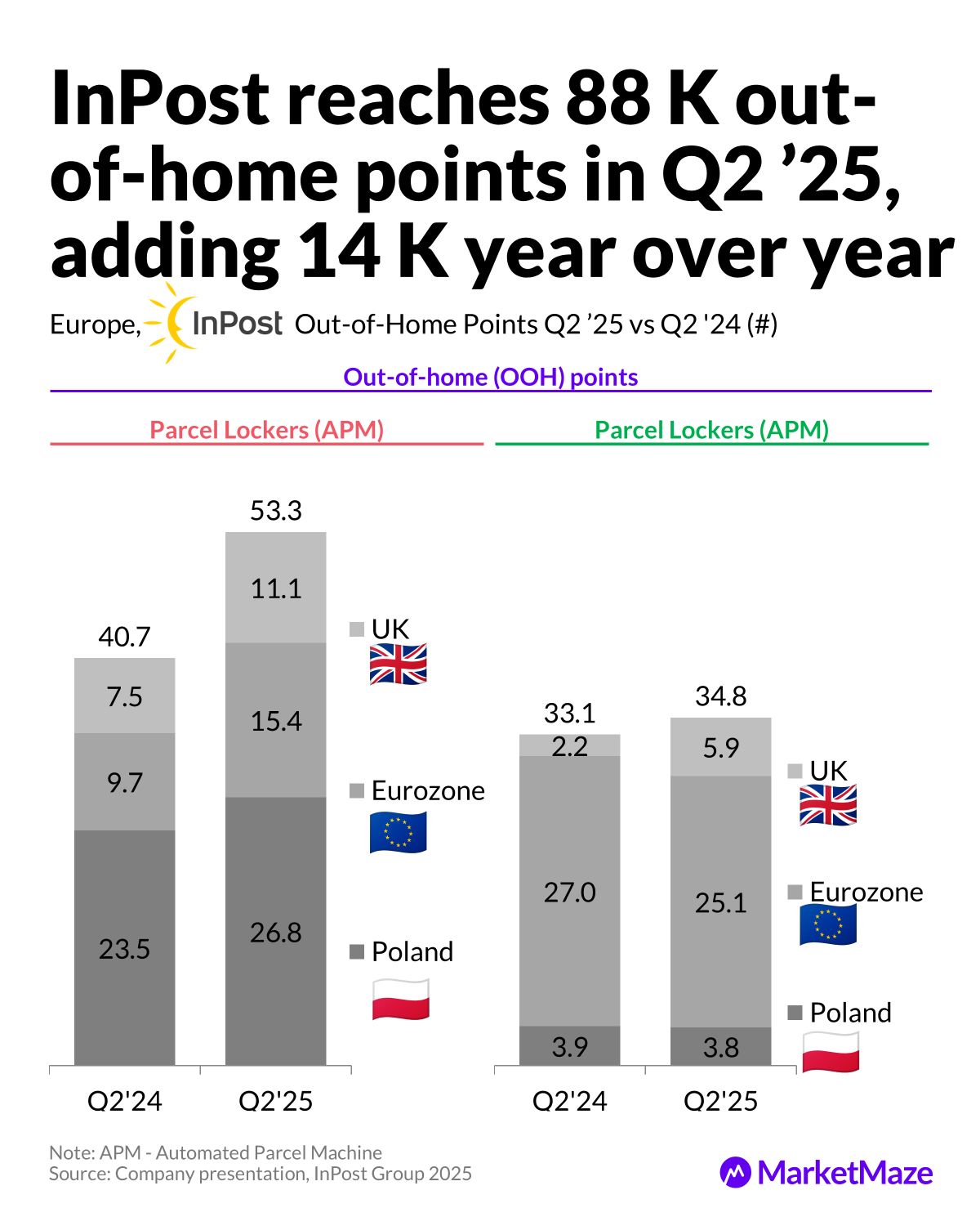 In Q2 2025, InPost reached 88,000 out-of-home points, adding 14,000 in just a year. The network now includes 53,000 parcel lockers and 35,000 pickup points across Europe. The UK and Eurozone drove most of the growth, while Poland remained steady at 27,000 lockers. With 14,000 new sites in a single year, InPost’s reach now rivals that of traditional national carriers.