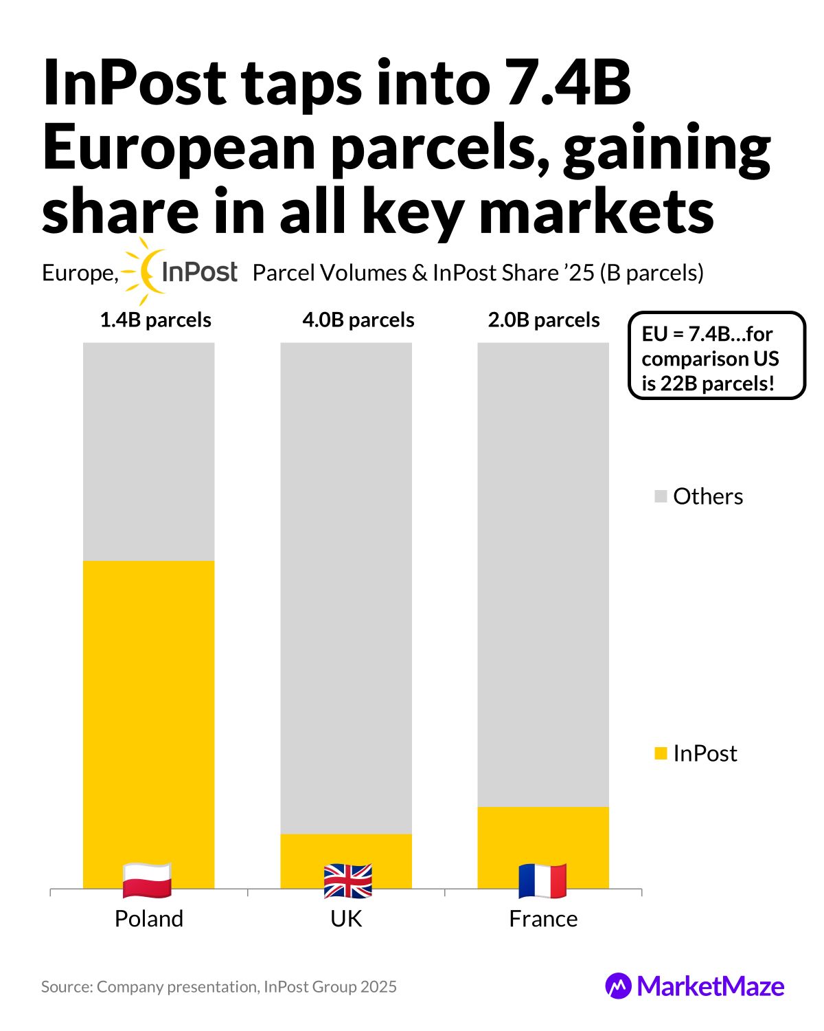 Europe ships around 7.4 billion parcels a year, with InPost capturing an ever-growing slice of that pie. It owns roughly 60% of Poland’s market, 10% in the UK, and 15% in France, moving about 1.5 billion parcels annually. For context, the US moves 22 billion parcels, showing Europe’s room for growth. InPost’s focus on locker-first delivery positions it perfectly for that expansion wave.
