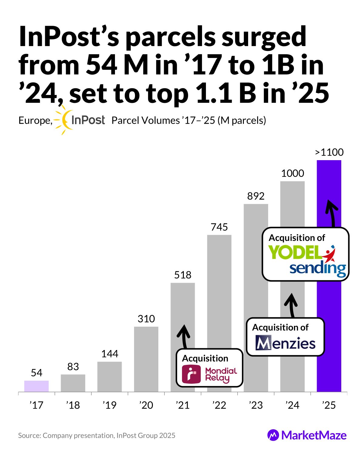 InPost’s parcel volumes exploded from 54 million in 2017 to nearly 1 billion in 2024, on track to exceed 1.1 billion in 2025. Strategic takeovers like Mondial Relay, Menzies, and Yodel accelerated the shift from a national to a European network. Each acquisition opened a new market and cut last-mile costs. The curve is exponential—proof that scale in parcel logistics is now a data and density game.