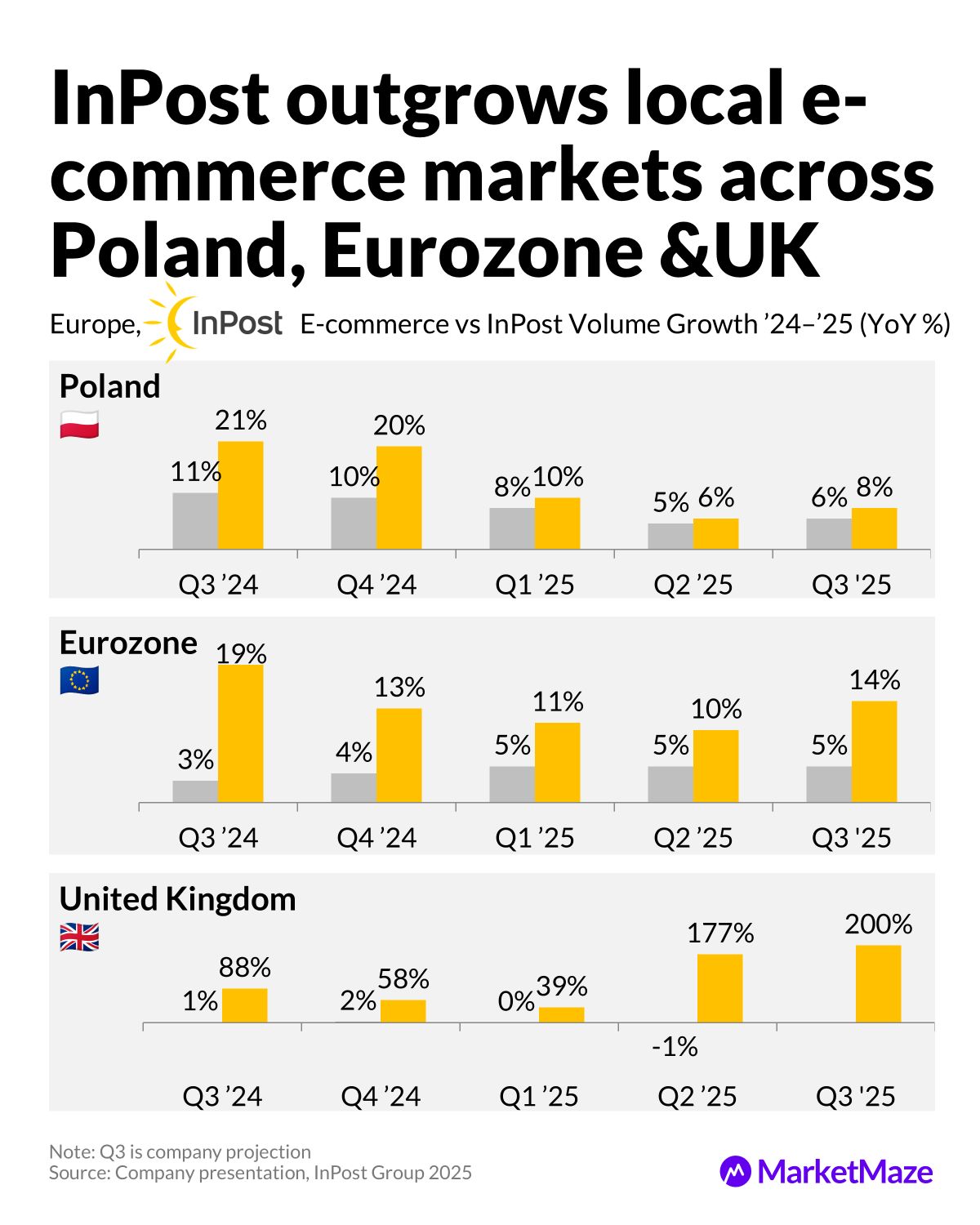 InPost is growing faster than e-commerce itself. In 2025, its parcel volume rose 6% in Poland, 10% in the Eurozone, and a staggering 177% in the UK against flat or shrinking markets. The company’s model scales with adoption—every new locker lowers costs and raises usage. InPost isn’t just riding the e-commerce curve; it’s building the infrastructure that powers it.