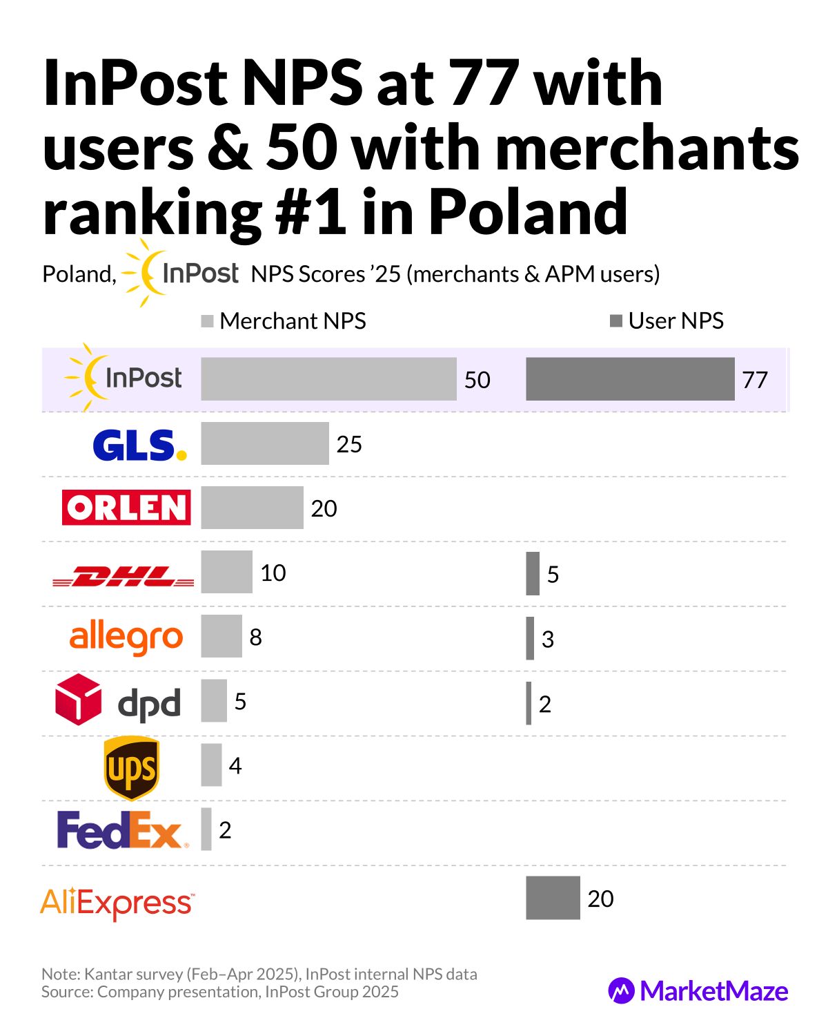 Customer satisfaction fuels InPost’s dominance. It scored NPS 77 with users and 50 with merchants, ranking first in Poland. Over 14.6 million app users—70% of all locker customers—generate 80% of volume. No other delivery app in Europe has that kind of engagement. InPost turned convenience into loyalty and loyalty into a competitive moat.