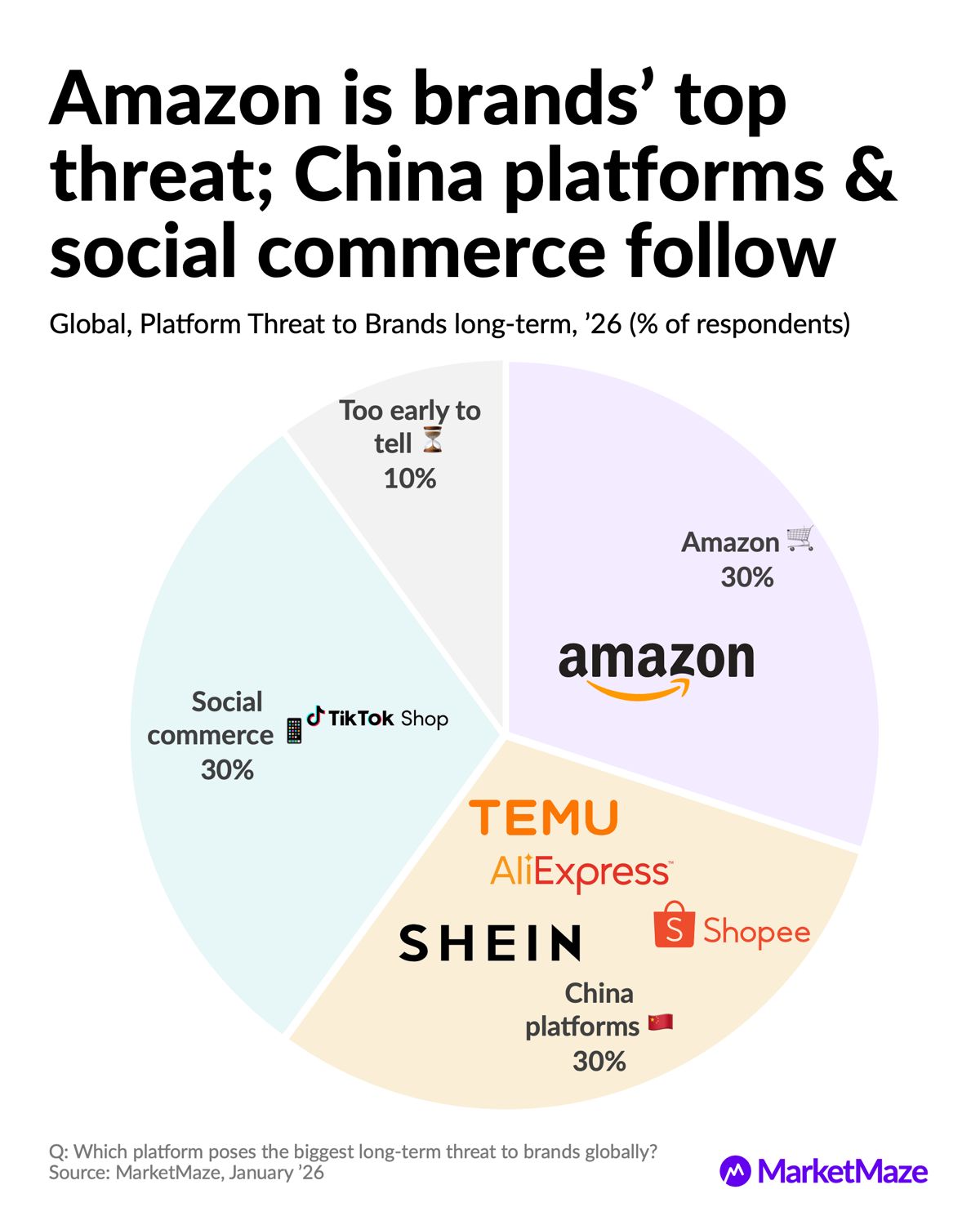 In Jan ‘26, only 30% of industry respondents named Amazon as the top long term threat, while an equal 30% pointed to China platforms like Temu and Shein, showing price disruption now rivals platform dominance in brand anxiety.
