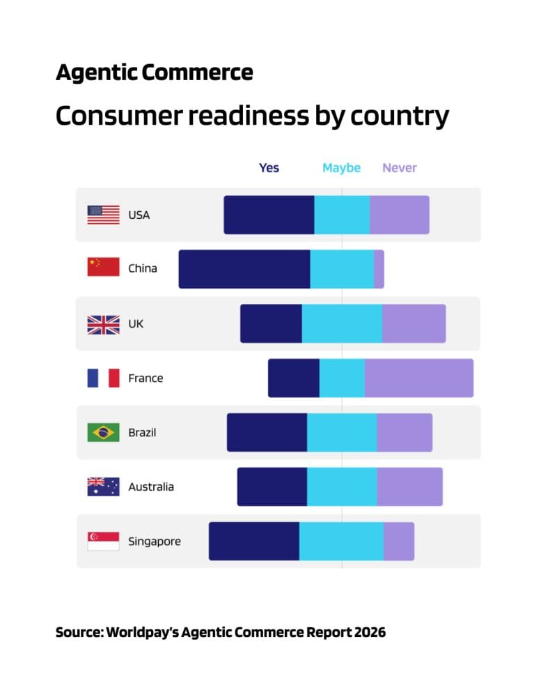 In 2026, consumers in China show the highest willingness to let AI purchase products automatically, while France remains the most cautious market, highlighting how digital payments and mobile ecosystems shape comfort with automated commerce.