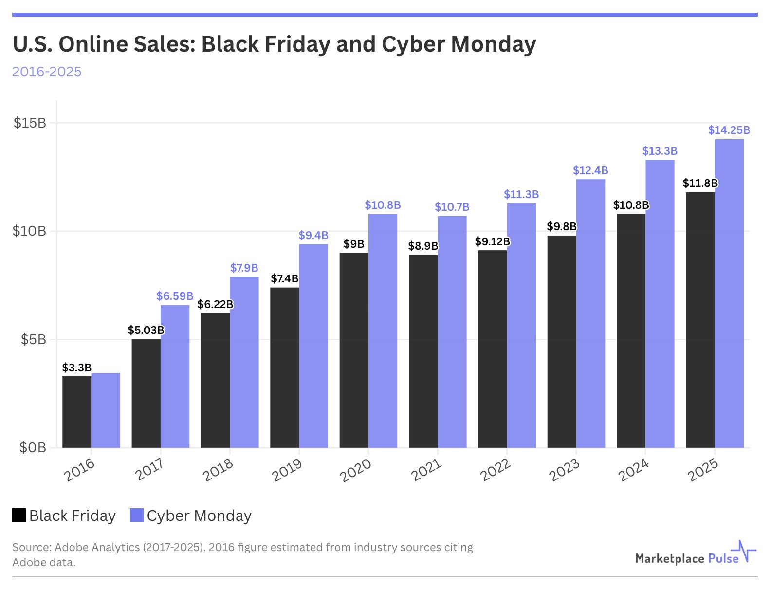 In 2025, Cyber Monday reached $14.25B and Black Friday $11.8B, both growing year over year despite tariffs pushing US customs revenue close to $120B.