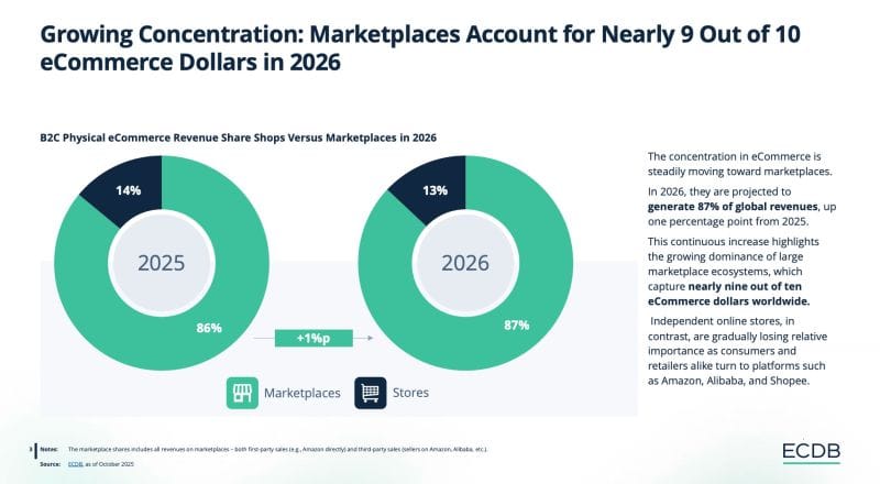 Marketplaces are projected to capture 87% of global B2C ecommerce revenue in 2026, up from 86% in 2025, leaving just 13% for standalone shops.