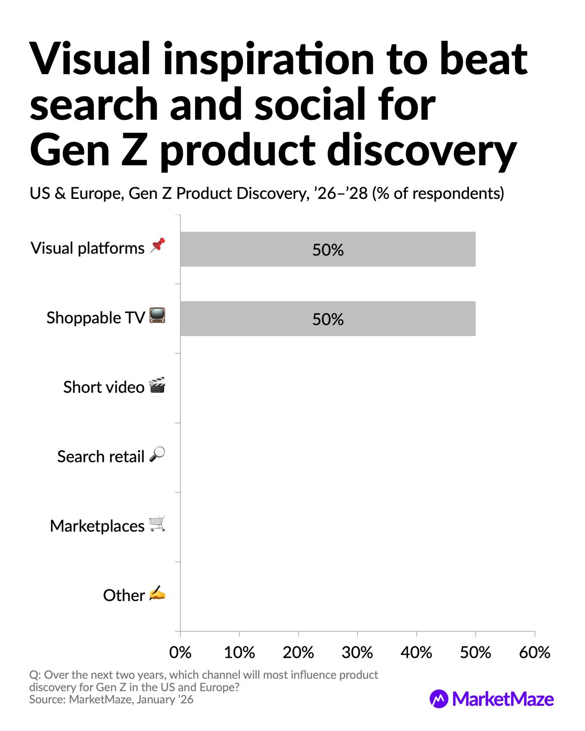 In a Jan ’26 MarketMaze survey, visual inspiration and shoppable TV tied at 50% each as the top Gen Z discovery drivers for ’26–’28.