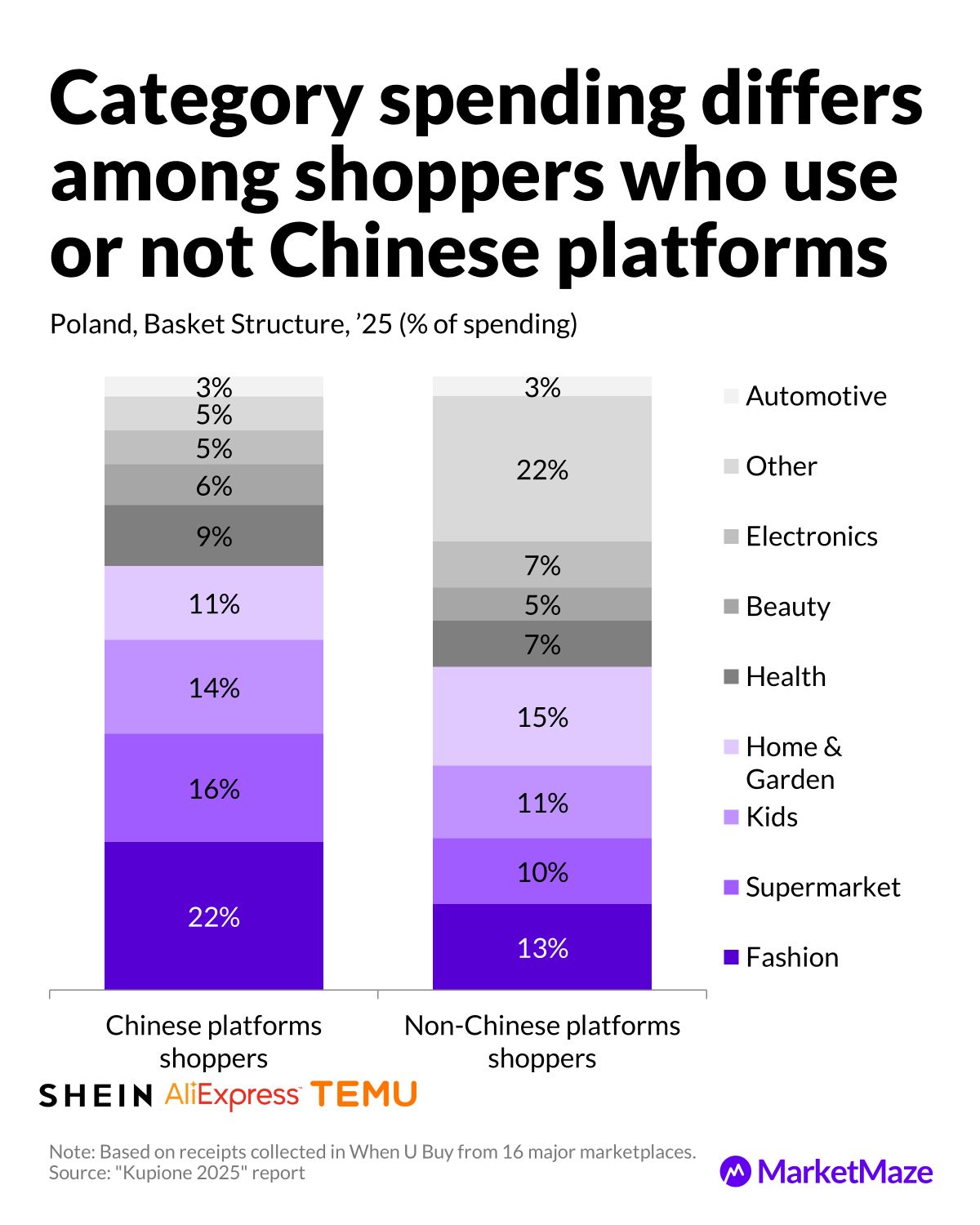 Spending structure confirms that Chinese-platform users focus on small, functional items while non-Chinese shoppers anchor their spend in fashion and supermarkets.