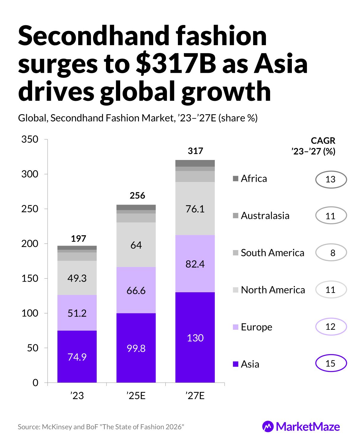 → Secondhand fashion jumps from $197B in ’23 to $317B in ’27, with Asia lifting its share to 41% and North America holding near 25%, showing global demand widening fast.