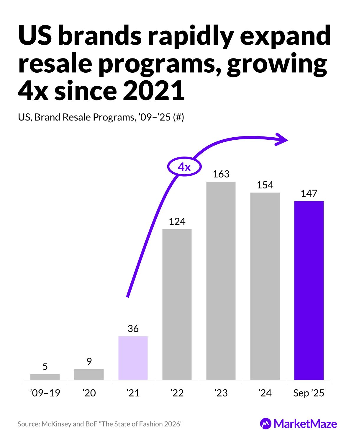 → US brands expand resale programs from 36 in ’21 to 147 by Sep ’25, a 4x jump that signals institutional adoption and new customer acquisition pressure.