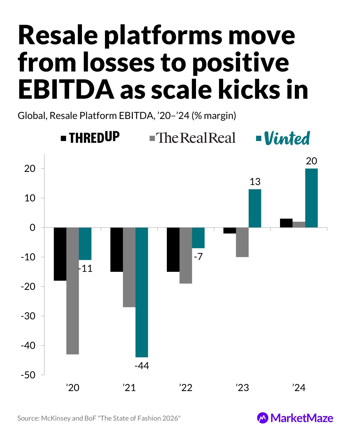 → Resale platforms reverse years of losses as EBITDA margins swing from negative double digits in ’20 to 13% for ThredUp and 20% for Vinted in ’24, proving scale economics kick in.
