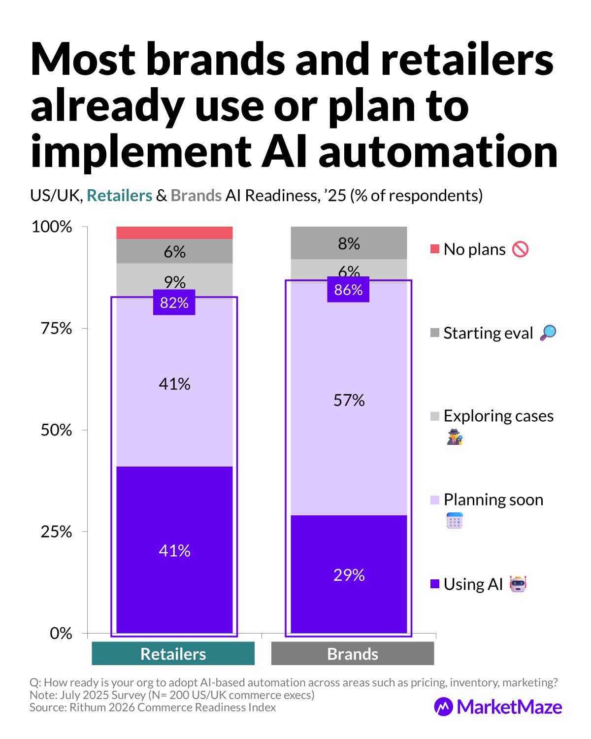 Automation is no longer experimental. 41% of retailers and 29% of brands already use AI across operations, while another 57% of brands and 41% of retailers are preparing to implement soon. The message is simple: AI isn’t the future—it’s the infrastructure.