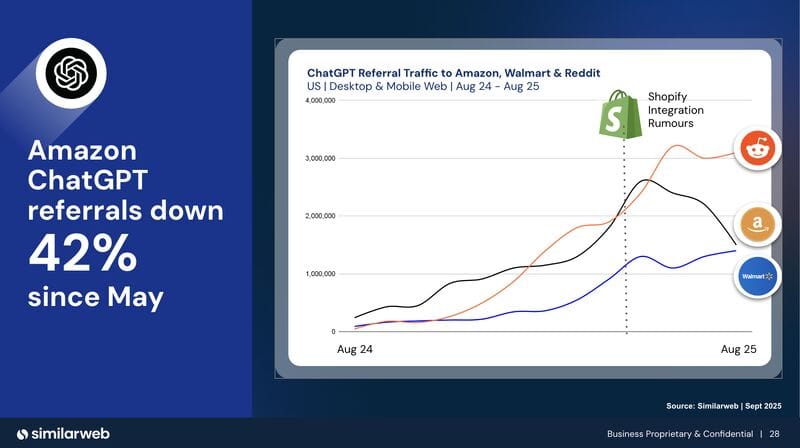 Amazon’s referral traffic from ChatGPT dropped 42% since May, even as ChatGPT became the world’s 5th largest site. Etsy’s ChatGPT referrals tripled in the same time. AI platforms now drive instant checkouts and convert at 12%, outpacing most marketing channels. The future battleground is AI controlling the entire shopper journey from discovery to checkout. 👉 LinkedIn