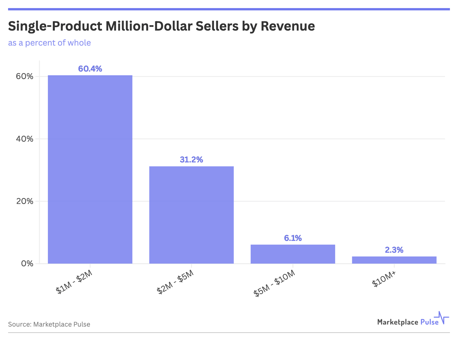 Over 800 Amazon sellers earn $1M+ per year with just one product, but most (60%) stay between $1–2M. Only 19 break $10M, and the risk is huge—one supply or algorithm hit could sink the entire business. Hero Cosmetics used a single SKU to start, then diversified and sold for $630M. This model wins on focus but loses on resilience. 👉 Marketplace Pulse