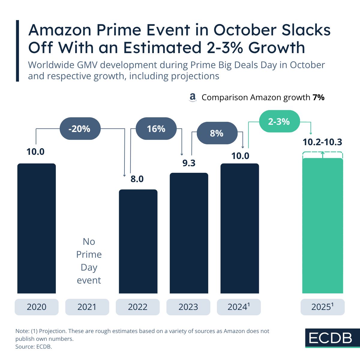 Amazon’s October Prime Big Deal Days is projected to hit $10.2–10.3B in GMV for 2025, up just 2–3% from last year. That’s a slower pace than Amazon’s 7% annual growth and well below July Prime Day’s gains. The October event is squeezed by other mega-sales like Black Friday and Singles’ Day, making shoppers less eager to splurge early. Competition from Shein, Temu, and AliExpress also keeps pressure high. 👉 ECDB
